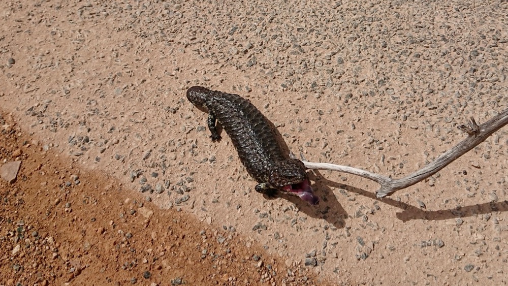he was about to cross the road and nat gently used the stick to persuade him to re-consider that whole idea of checking whether the grass was really greener on the other side. he was not amused but in the end he saw reason. or the stick. good deed of the day: saved a shingleback lizard.