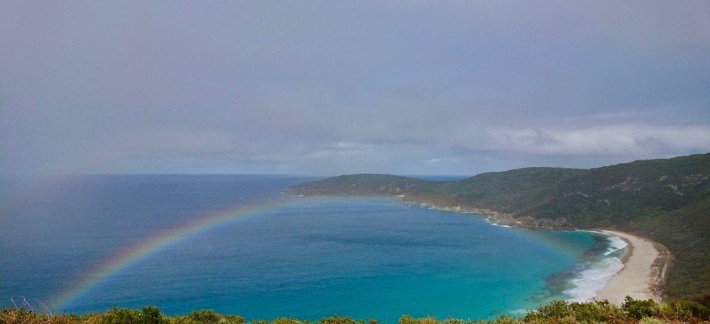 how often can you look down on a rainbow? a nice circular one, too? sometimes it pays to stand outside in the drizzle (the girls were having lunch in the car). that’s shelley beach down there. no idea who that was named after but wikipedia mentions that the main assassins spider – endangered – is endemic to the area. we didn’t see any.