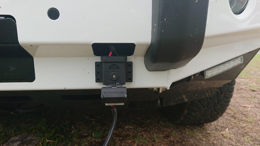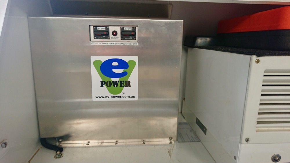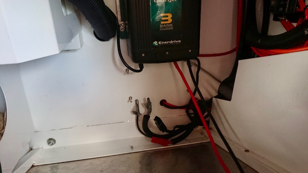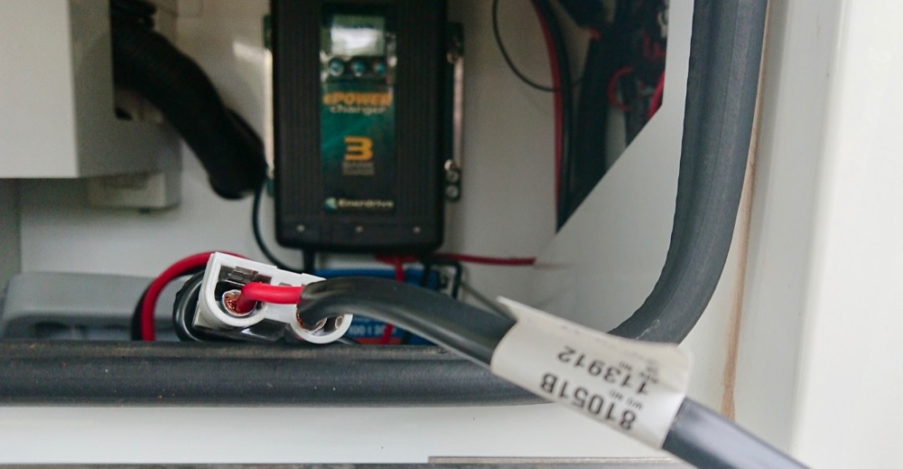 well it can and now it does. all it took was a little anderson plug connected to the ‘bank 2’ terminals on the mains charger and another one on the bull bar. now i can charge the car through the van when we are on mains power. handy.