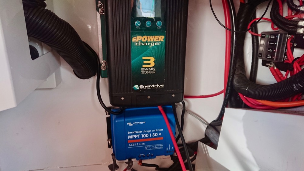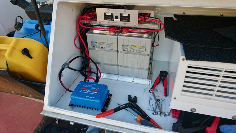 i have long thought about relocating the solar controller (that i installed before we left) to the front box. the theory – if you are interested – is that you want the high current side, i.e. from the controller to the batteries, to be as short as possible to reduce the voltage drop across the wires. and maybe use thicker wires as well, that reduces the resistance and therefore the voltage drop so you get the correct voltage at the battery terminals. batteries are a bit picky when it comes to charging voltage.