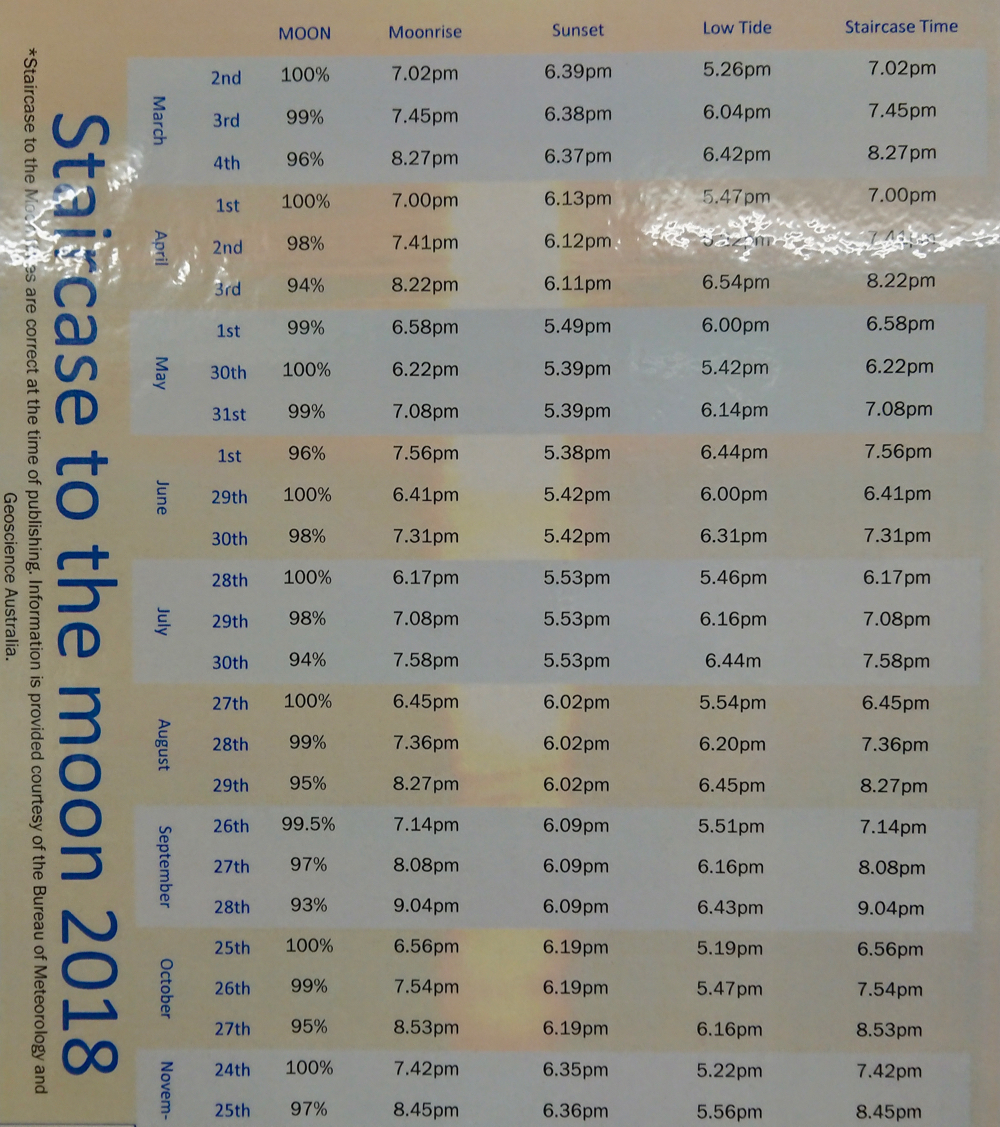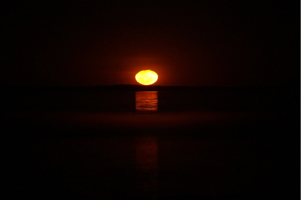it is still very cool to see the blood red moon rise over the sea. we were lucky to be here just in time for a i/ full moon rising ii/ just after dark iii/ during a low tide. yep, that all is required for the perfect spectacle, called stairway to the moon. it also helps to have no cloud cover.
