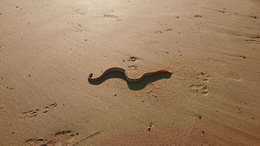 we also found this little guy on the beach, a sea snake. we don’t think he was in good shape, he hardly moved. natalie still tried to save him and carried him back to the water. we hope he’ll be ok.