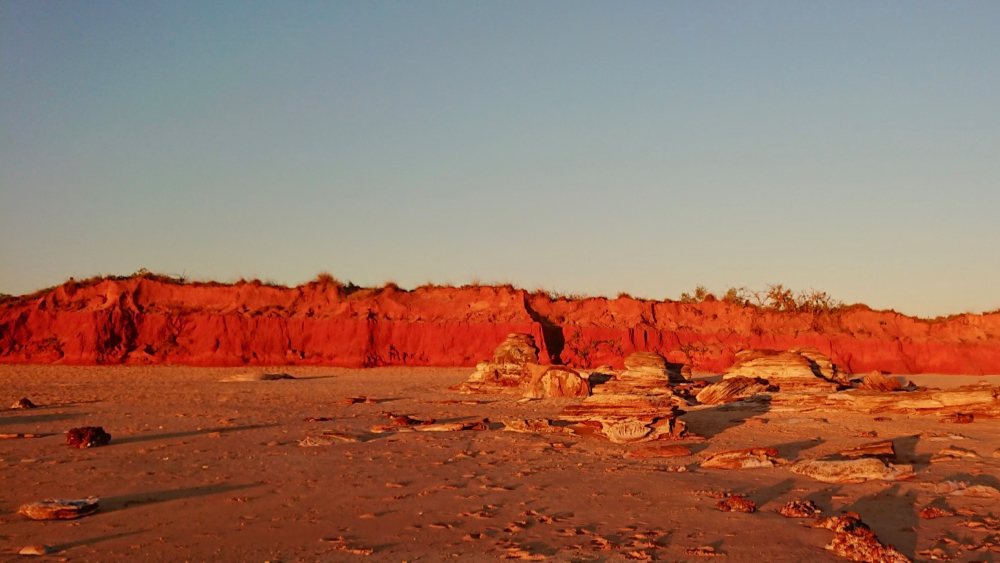 the famous red cliffs of broome. the red cliffs, the sand and the ancient limestone slabs make this an amazing place for a sunset walk.