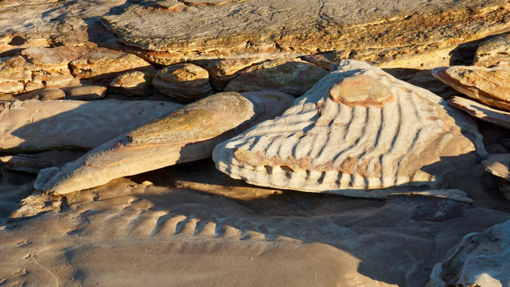 interestingly there are no detailed maps of, or signs pointing to, the footprints. this appears to have several reasons. partly it is due to the fact that the prints, while made of stone, can easily be damaged or destroyed. especially when, and this has actually happened, someone tries to cut one up with an angle grinder to sell it. or when people try to use shovels to dig them out of the sand.