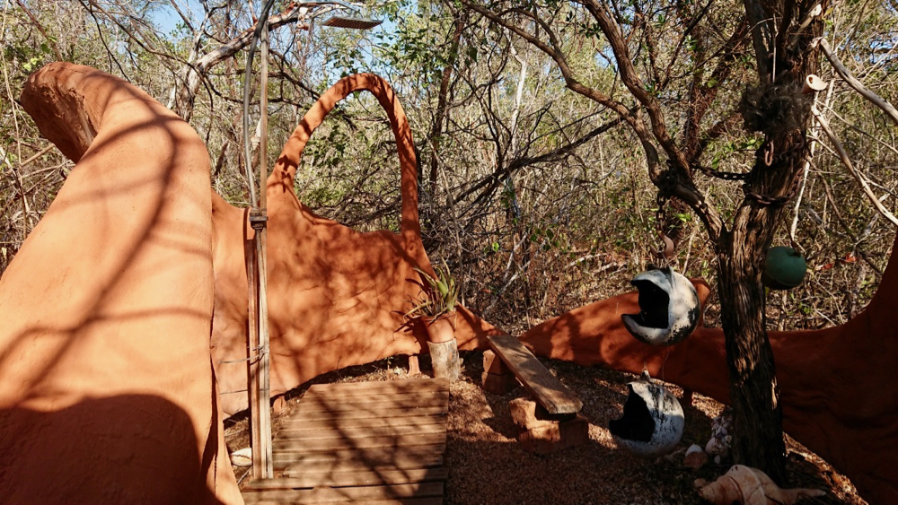 the toilet is interesting, too. the usual long drop, but this time elevated. i wonder if, given the increased height, the discharge reaches terminal velocity on the way down and is incinerated due to the friction on re-entry, a bit like the chinese space lab not long ago (*). in any case it does not have a door but instead a little sign saying ‘free’ on one side and ‘in use’ on the other (you can just see it). i guess one can also sing to ensure nobody crashes the party.