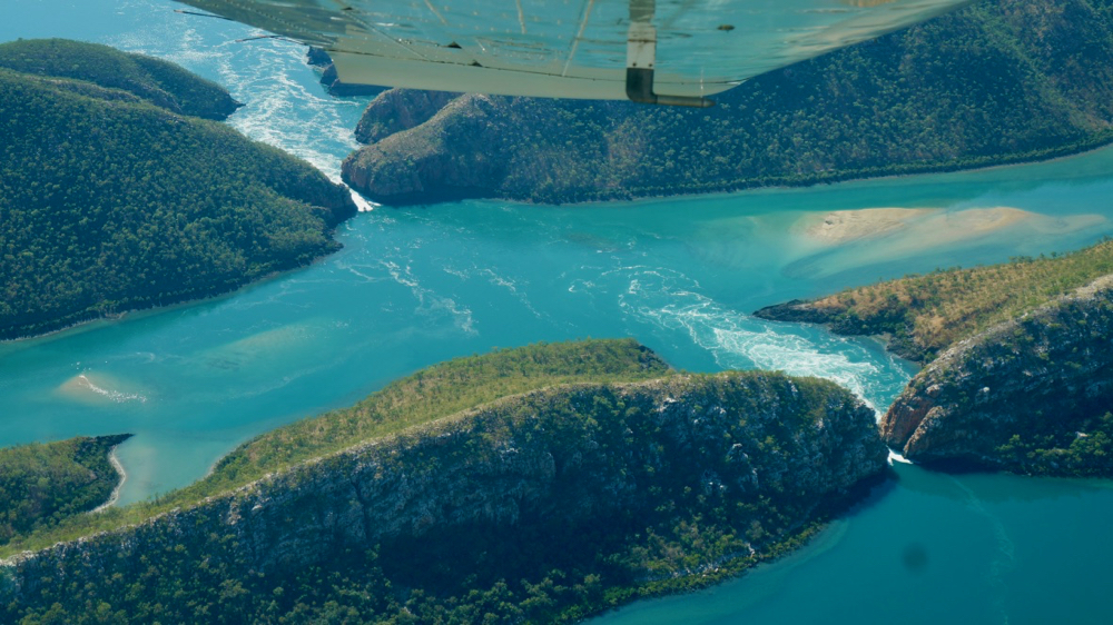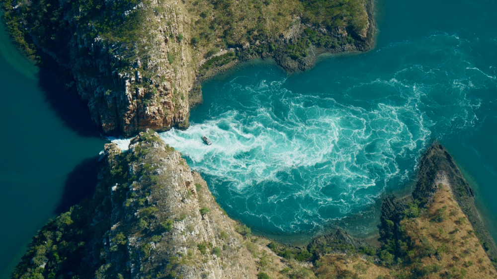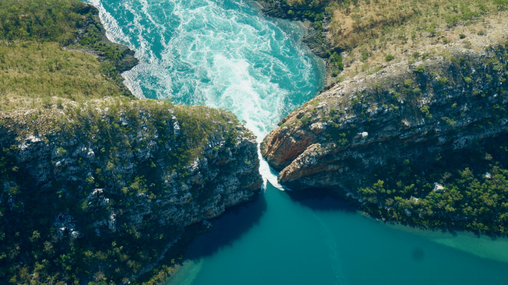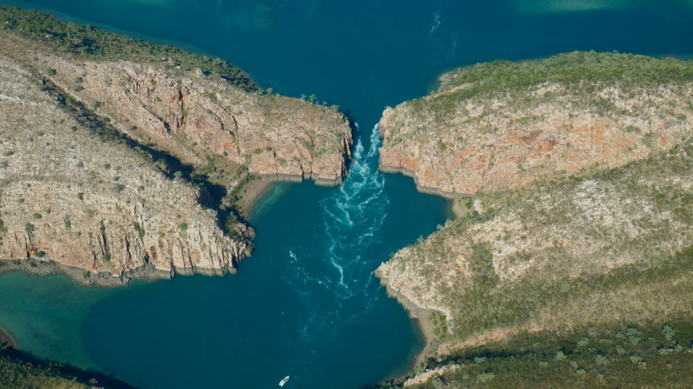 the horizontal falls are a break in the mclarthy ranges, just a tiny 25 meter gap. and twice every day the tide forces the sea water into tidal reservoirs behind the ranges, and twice it falls back towards the ocean.