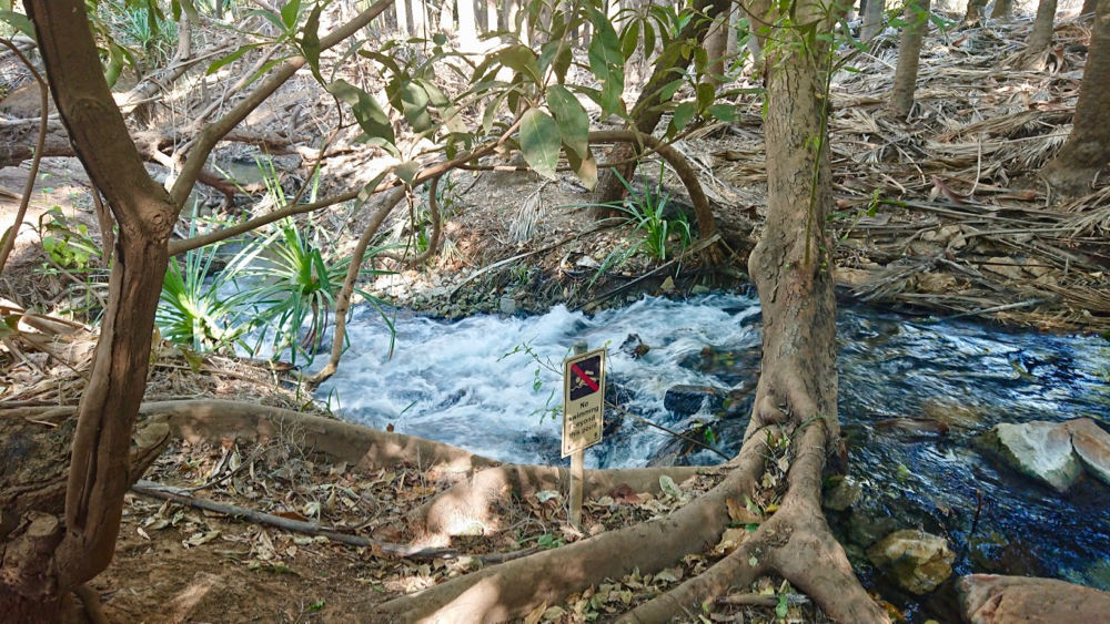 the mataranka hot springs on the south side are similar. this is the place referred to in the famous book ‘we of the never never’. btw: those are bats in the trees, not coconuts.