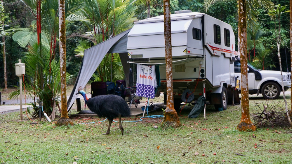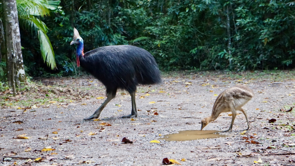 on cassowary day we saw thornton and his chick again and later ran into (not over) another one with a bigger chick on the way north. that is really good to see, the cassowaries are endangered. being the massive birds they are their only real enemies is … us. cars in particular seem to do the most damage.