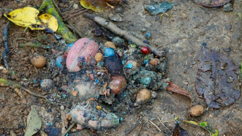 their diet is mainly rain forest fruit, about 150 different kinds, which they swallow whole. and as we have seen, a lot of it seems to come out the other end almost like it went in. no, we’re not kidding. we took photos!
