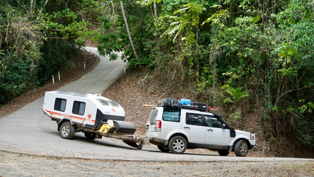 from daintree village we took the bloomfield track along the coast further north. the bloomfield track is not very long (40 km) and not very rough either; the main challenge is a number of steep climbs that require low range. the track is well maintained, though, but might be a bit of a challenge in the wet.