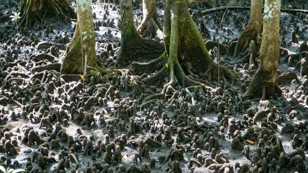 the mangroves are busy reclaiming land from the ocean. there are several different kinds of mangroves and all have their favourite place between the ocean’s salt water and the firm ground of the rainforest, depending on how much salt they can tolerate.