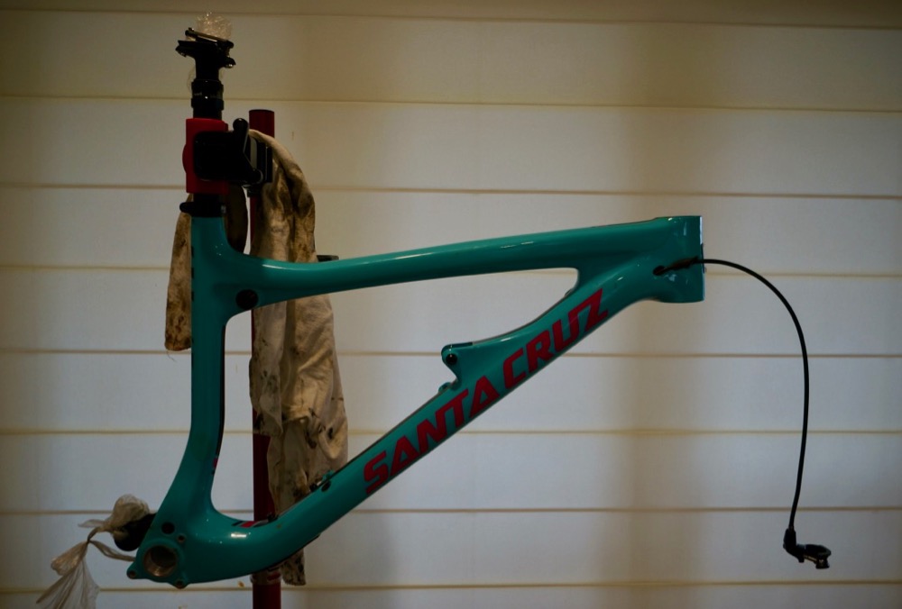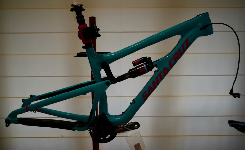 they also go together perfectly with a santa cruz nomad frame, which arrived today (finally!). it’s just a bit bigger than nat’s current nomad alloy v2 and a long way smaller than its twin – mine.