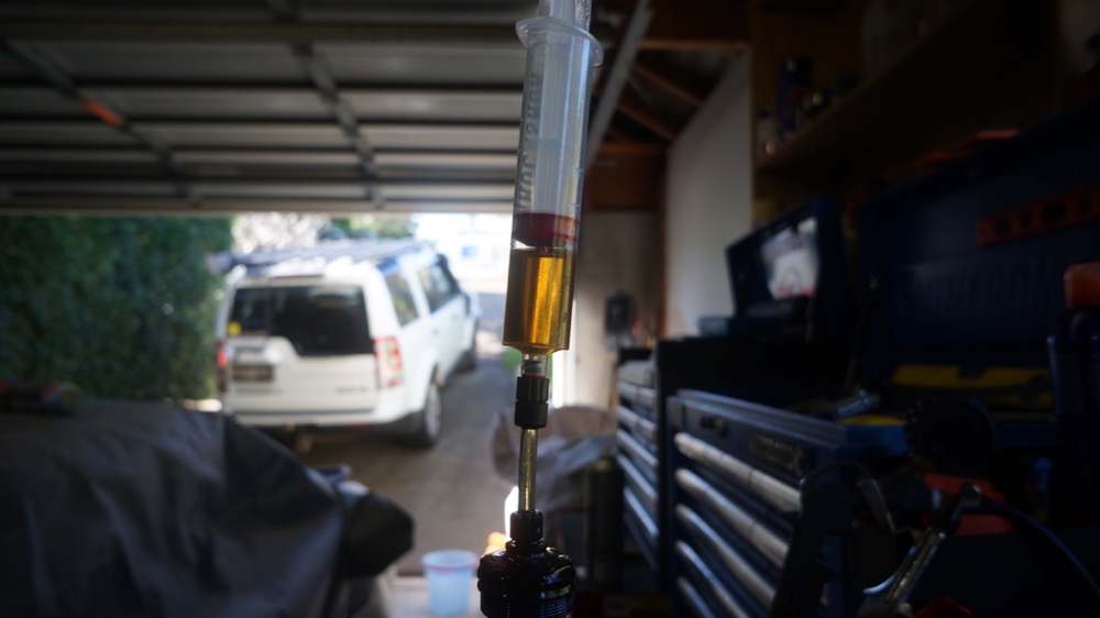 that’s what it looks like. moving the suspension fluid between the damper and the syringe gets rid of the air that would otherwise mess up the dampening circuit. it’s very satisfying, pushing the oil back and forth, seeing the air draining out. it was pretty easy, too. did i mention satisfying?