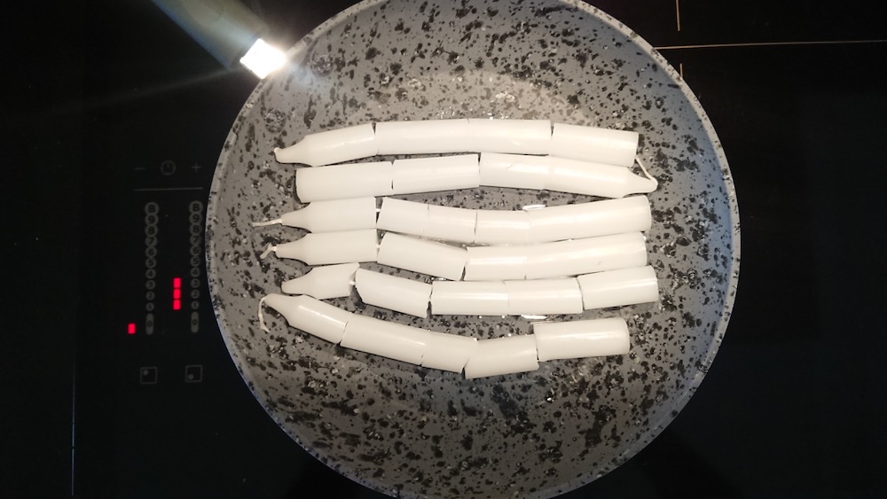 so when kris was out of the house and access to the cooktop unimpeded i did a little experimenting of my own. one part candle wax, one part paraffin oil, warm it up and bathe the meticulously cleaned chain in it.
