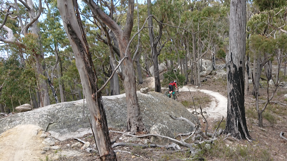 the trail drops more than 600 m over those 13 km, berm after berm and jump after jump. careful though, sometimes the trail turns and a little jump can send you straight into the tassie bush in a heartbeat.