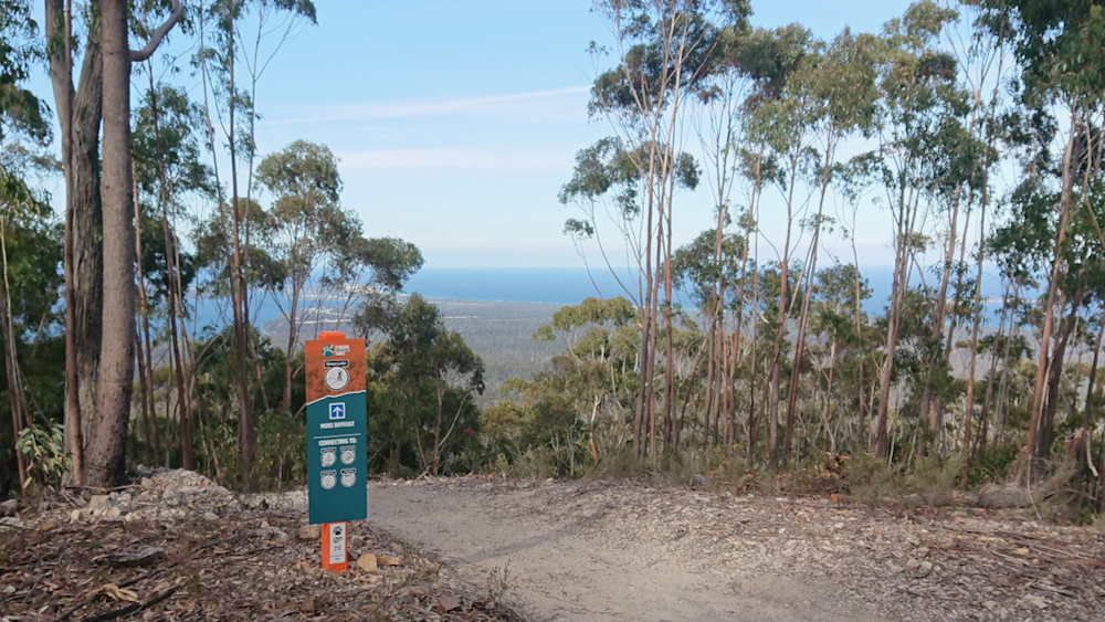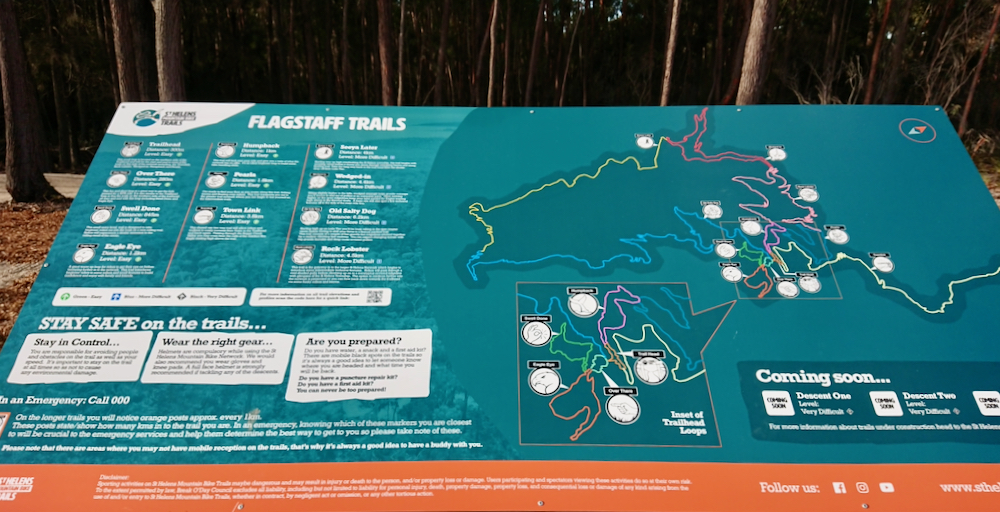 the st helens trail network is actually located to the south of town (whereas swimcart beach where the epic bay of fires trail ends is about 20 min north of st helens). most trails begin and end right here at the flagstaff trail head.