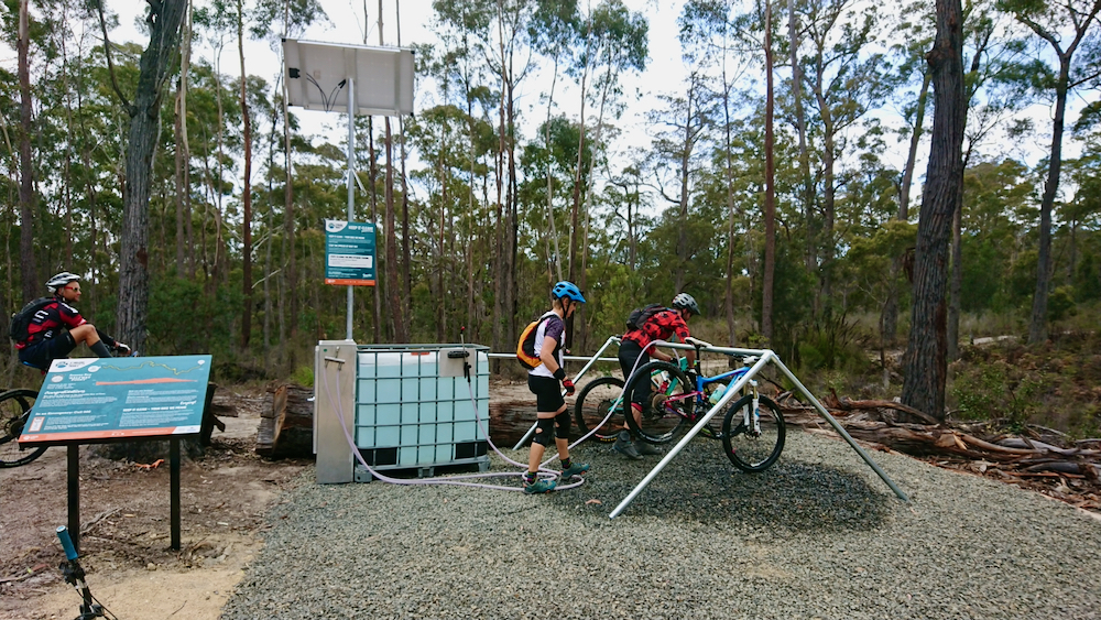 about half way in this bike wash station is not meant to clean the bike of a little dust or dirt; there is a root rot fungus that is unfortunately already destroying plants up at the blue tier and the solution in the tank is meant to kill it and slow its spread down the mountain. i hope all bikers use it.