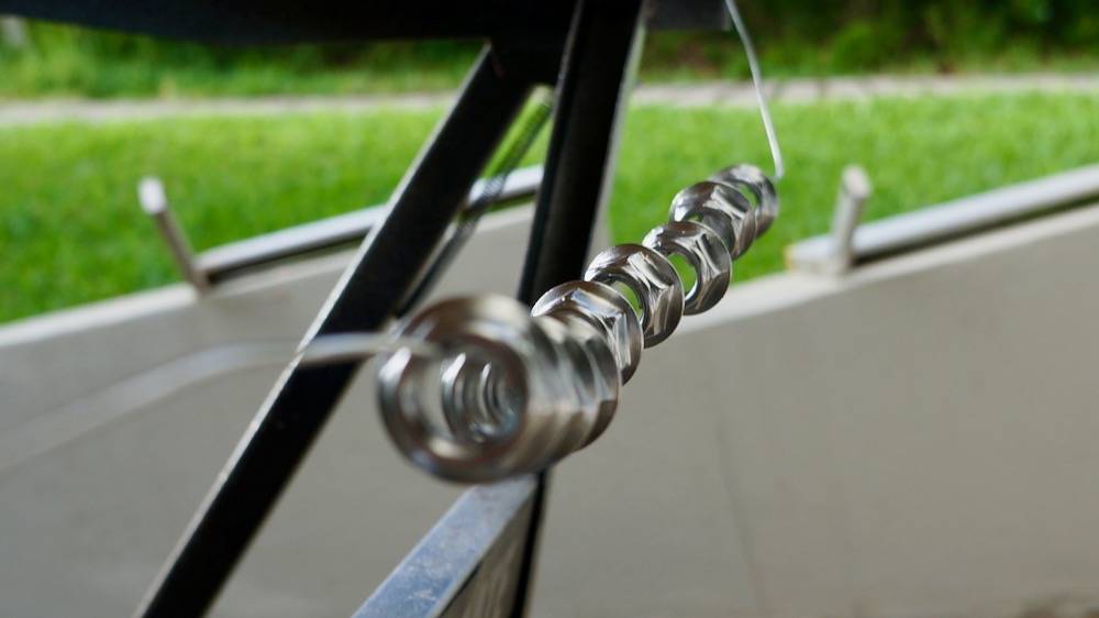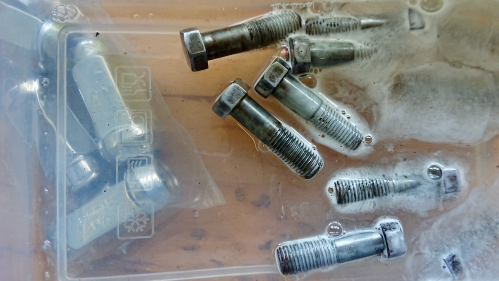 so are the nuts. looking great. the parts will have to dry for a day before i can go and reassemble the stairs with new nylon washers and a bit of waterproof grease. it’s always a difficult question whether to use grease or not: grease allows parts to move more freely but it also traps dust which over time transforms it into a grinding paste. there is no simple answer.