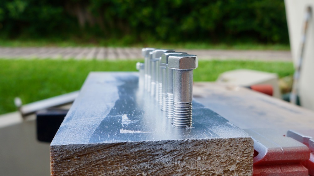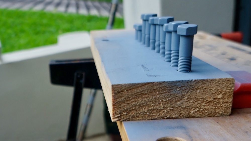 a few coats of primer, then some silver paint. the bolts are all shiny and new again. for now at least.