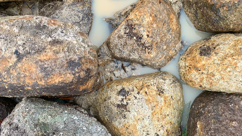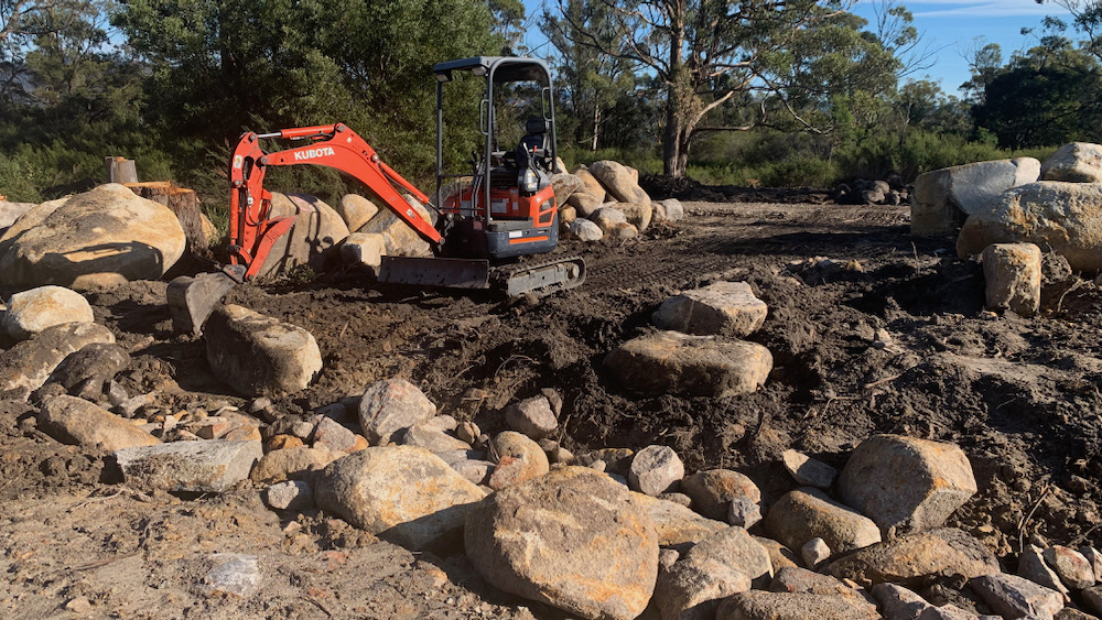 these granite rocks are very much natural, sustainable, locally sourced and perfectly suited to help us deal with stormwater management around the house. this isn’t a theoretical question: we just had more than 40 mm of rain on the weekend and it is amazing how much damage that can do to our driveway. the dry creek bed (that’s what it should be under normal circumstances) did its job extremely well, and directed the water around the house.