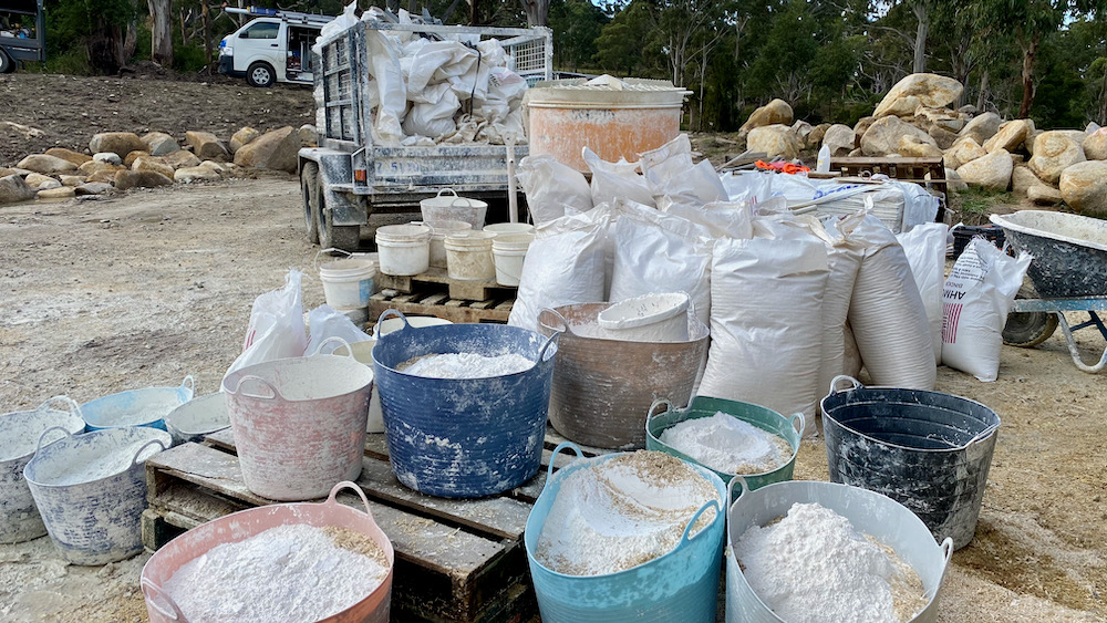 there are other pitfalls: restarting the process after a weekend can be tricky, because the previous wall would have cured to a point that the new layers may not stick to it as well as they should. the pros recommended sprinkling a bit of binder on the old layers to aid the adhesion – we just went a bit overboard with the sprinkling.