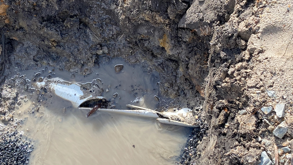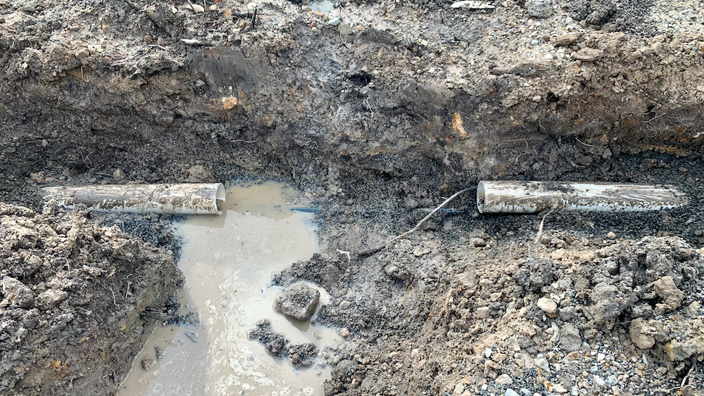 the original damage to the pipe was almost certainly also done by an excavator, albeit a significantly larger one. when the contractor moved the rocks around the water tanks into place he must have crushed it. the result was not only a lack of water finding its way into the tanks, but also the fact that the surplus water instead seriously washed out the crossing of the new and the old track up to the house.