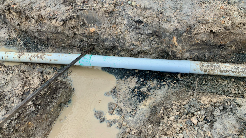 we were lucky that the machine appears to only have damaged one small length of pipe, a bit less than a meter. however, getting the replacement part in was no easy feat. after all, the sleeves need to extend about 50 mm left and right onto the old pipe … btw, the black & blue pipe underneath it is the return pressure pipe that directs the water back to the house, and somewhere a bit further below it are the electrical cables to power the pump.