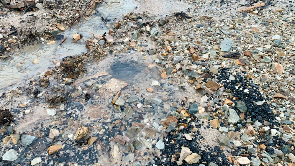 you can imagine our surprise – and disappointment – when we figured out that the rain water was disappearing into the pipes as it should, but none of it came out of the spout on top of the water tanks. it was not immediately apparent where things went off the rails; the little creek on the top left in the photo above is actually what the ‘dry creek bed‘ looks like when it isn’t dry. that hole just next to it, however, was a little suspicious.