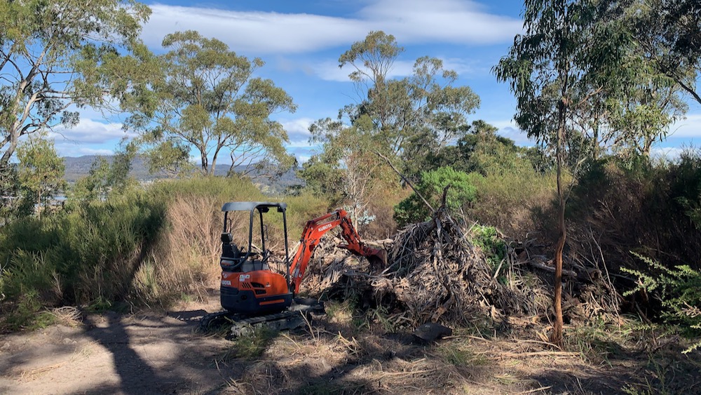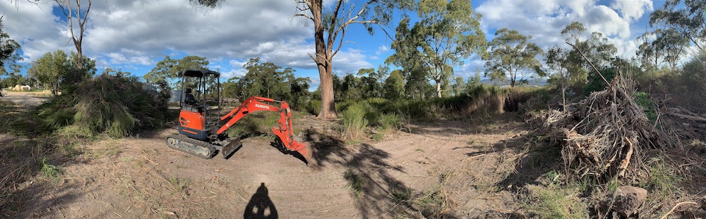 we are trying to remove as much as possible of the highly flammable kunzea from near the house. we’ll leave enough standing a bit further away, the animals really like it for shelter, and frankly we would never be able to get on top of it with our little machine anyway. we also would like to get rid of the last big pile of rubbish some previous owner left us as an unpleasant surprise in the bush. as soon as i carved a big enough fire break around it we’ll light it up.