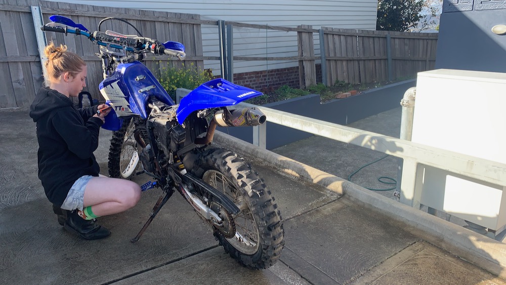 so we did what every parent in rural tasmania does in such a situation: we found a cheap old dirt bike she could ride on the property. this one is a 2009 yamaha tt-r 250, and it definitely had a full life. crusted on dirt, air filter so old we couldn’t properly clean it, bent subframe, knackered after-market pegs, chain so stretched it’s amazing it doesn’t fall off, and an electrical system that barely supports the basic functions.
