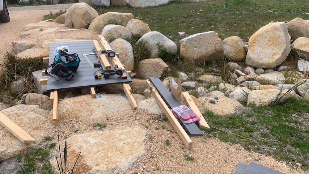 by the way, we will be using the same composite material (apparently 80% recycled material, timber and hdpe) for the deck on the south side of the house. with the supplied clips the decking can be built up quickly, however, cutting the material to length creates a lot of plastic swarf. disgusting.