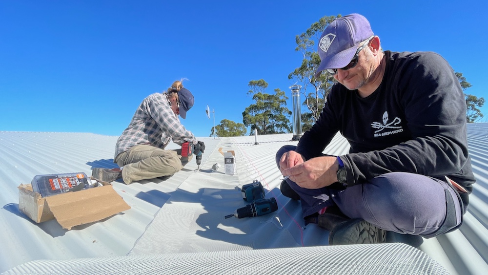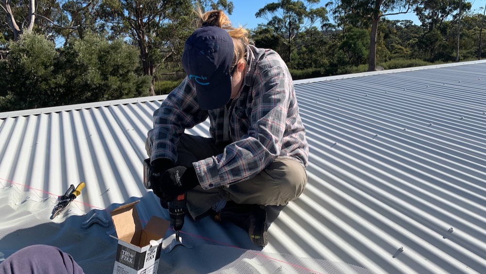 the angles of the valleys made for weird undulations of the mesh between the sides of the roof, but apart from that the installation was actually pretty straight forward. it took nat and i a few hours but we’re pretty happy with the result: we don’t have to fear ember intrusion or accumulation, but the roof can of course still breath and rain water collection isn’t hampered either.