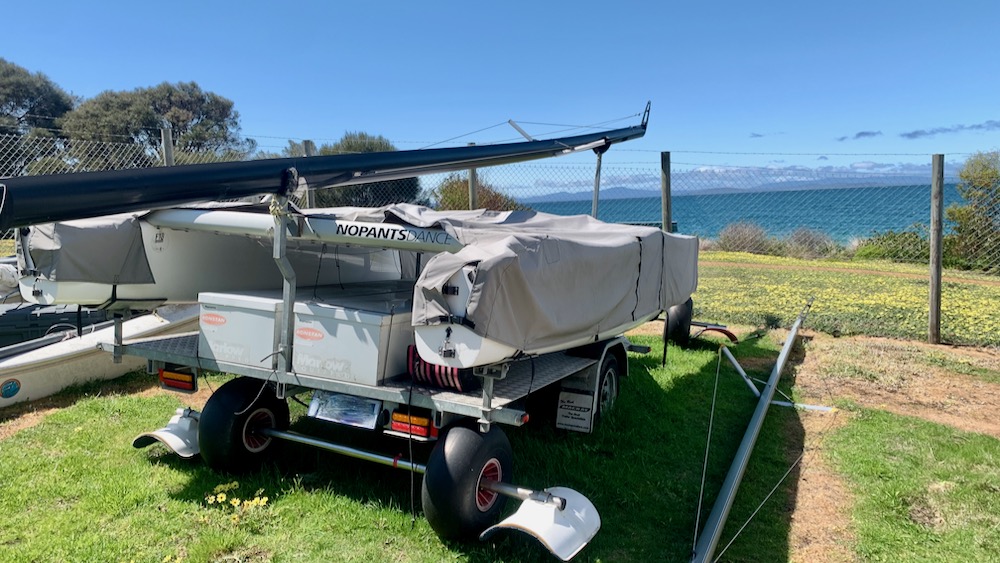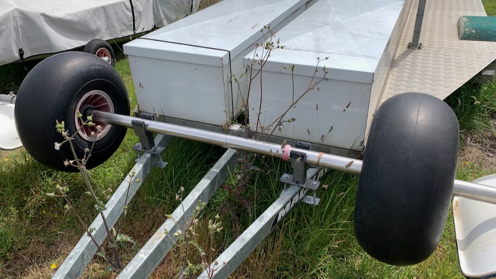one thing is that the boat is pretty long, wide and not really light but more importantly, the hulls are designed to live on a fairly malleable surface (water) and it gets damaged easily if it is in contact with another hard surface. the trailer also has two large sailboxes which store all the gear: center boards, rudders, sails, tiller extension and crossbar. there was only one thing the trailer didn’t have: a holder for the beach wheels.