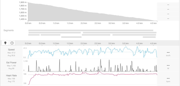 max speed 47kmh, max heart rate … 189. down hill! 175 average heart rate isn’t bad either. let anyone say that is not real work.