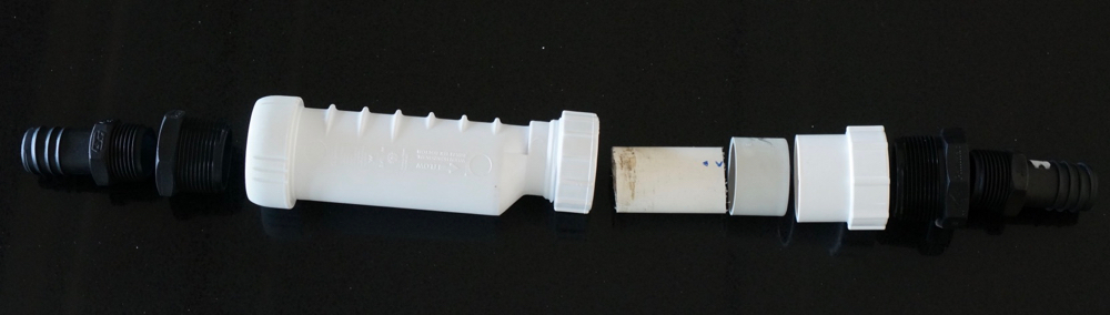 since i could not find it at any of my usual places i ordered one online. 32mm should be plenty given the hoses are all 25mm. except that when i started looking for a way to connect the 25mm barb to a 32mm screw the gentleman at the shop informed me that nobody makes 32mm hoses any more. lucky for me he still had about 30cm of 32mm hose lying around and graciously gave me 4cm of it. that then went into a 32 outer to 40 inner converter that would go into a 40 flat to screw into which i could screw a 40 screw to 25 screw reducer and finally the 25 barb. on the other side it was a ‘simple’ case of a 40 screw to 25 screw reducer and a 25 barb.