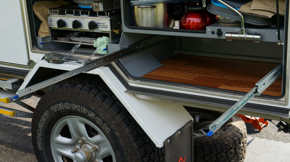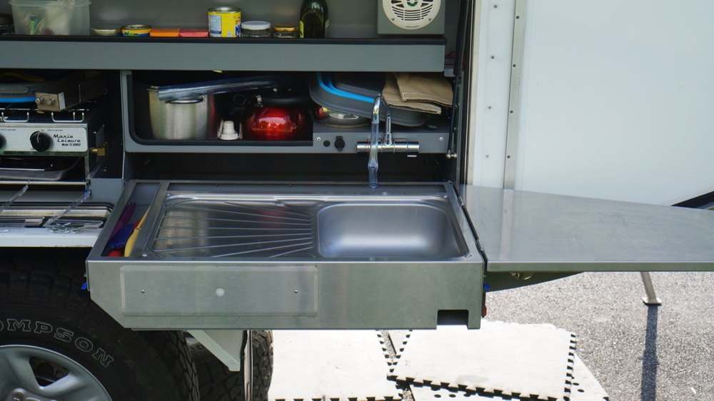 it still does not lock into place properly when fully extended but we’ll survive that little problem. also check out the cool low tech solution to avoiding water spillage into the rear knife compartment (the tap is a little too short): we pulled a bit of clear hose over the tap and now the water runs into the sink and not everywhere else.