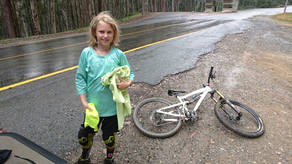our strategy of keeping all of us sane involves mountain bikes, jumps, berms and where possible shuttles. that results in a happy, motivated and at the end of the day tired 11 year old girl who agrees this is fun! it also gives me the opportunity to improve my coaching skills (with particular emphasis on the development of rising female talent, a very timely skill i am led to believe) and mum has us off her back for a while before we return for food or a shuttle. so far it appears to work well.