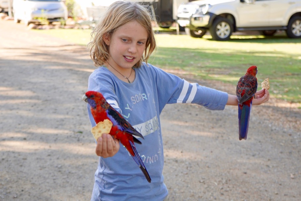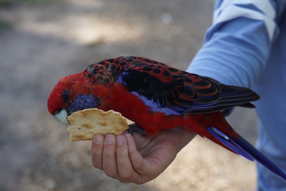 the rosellas are much safer to touch, also easier than the cockatoos which according to our resident expert (nat) have more powerful claws.